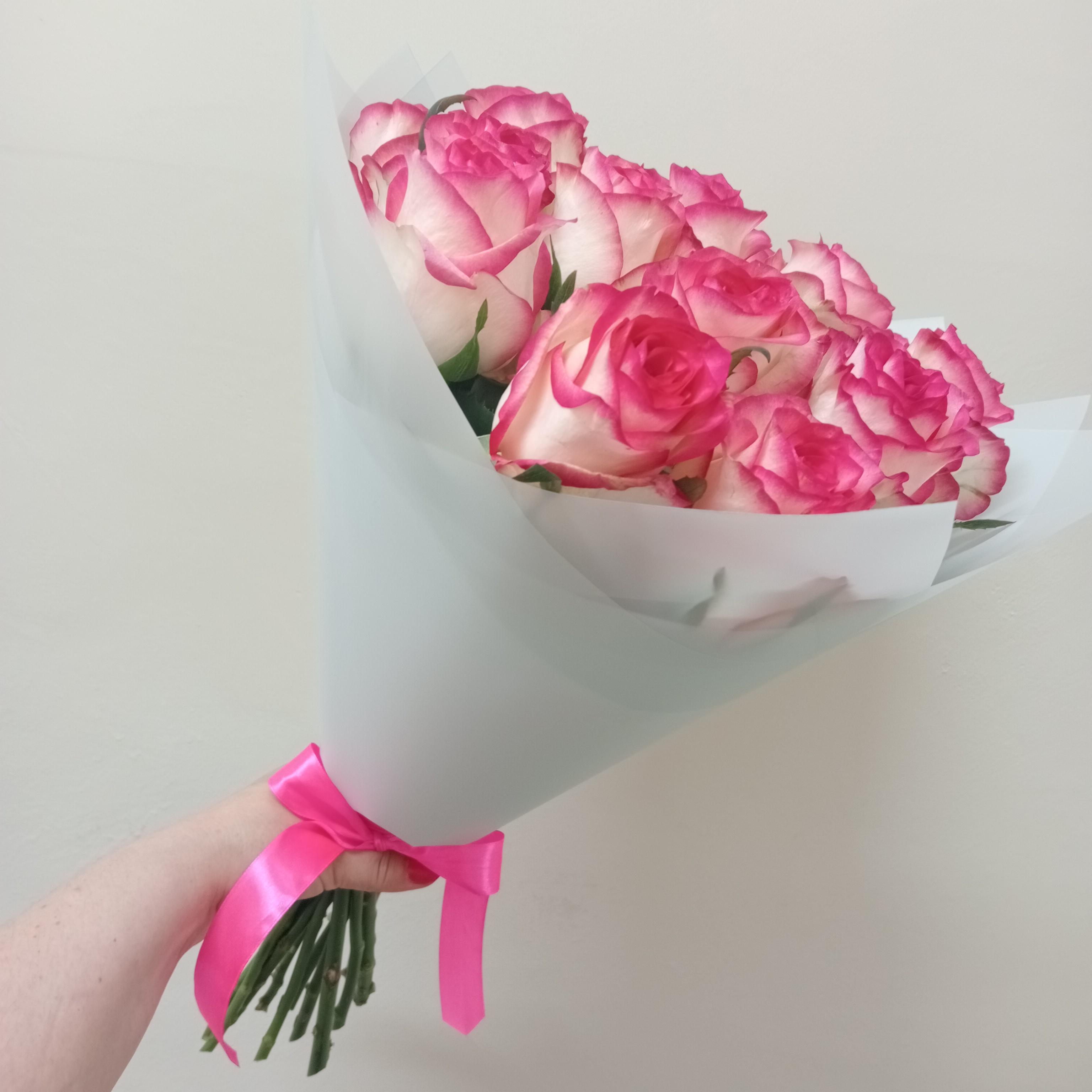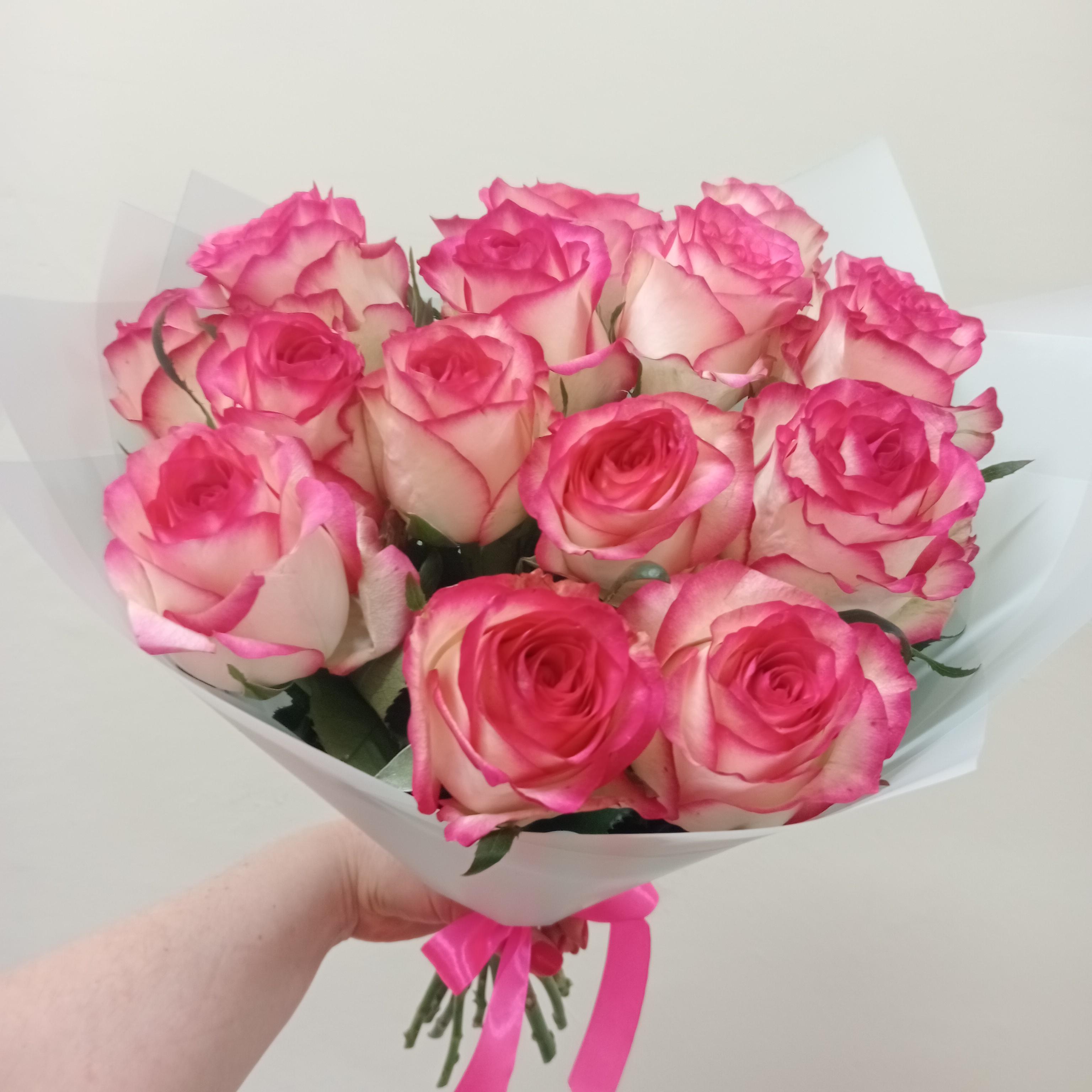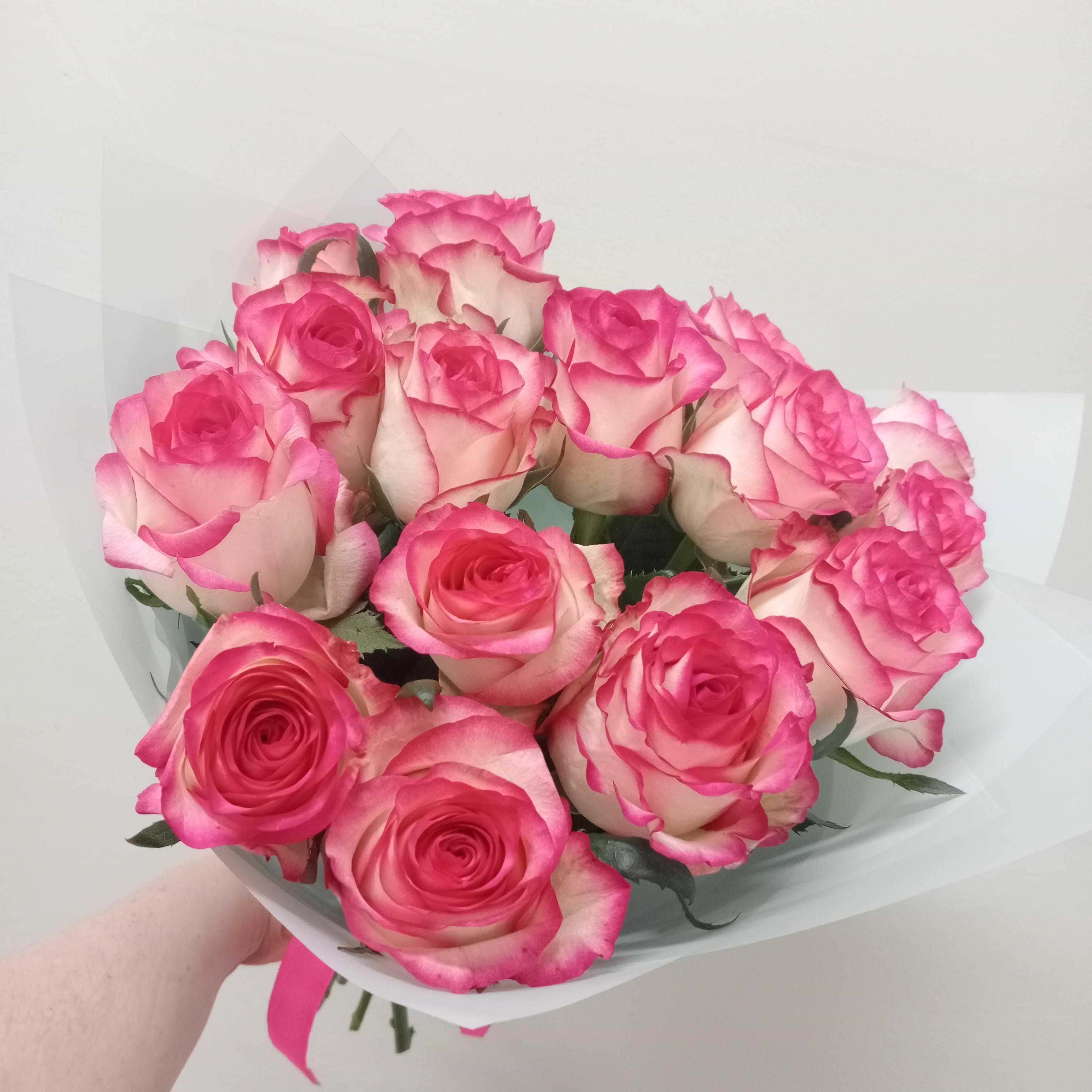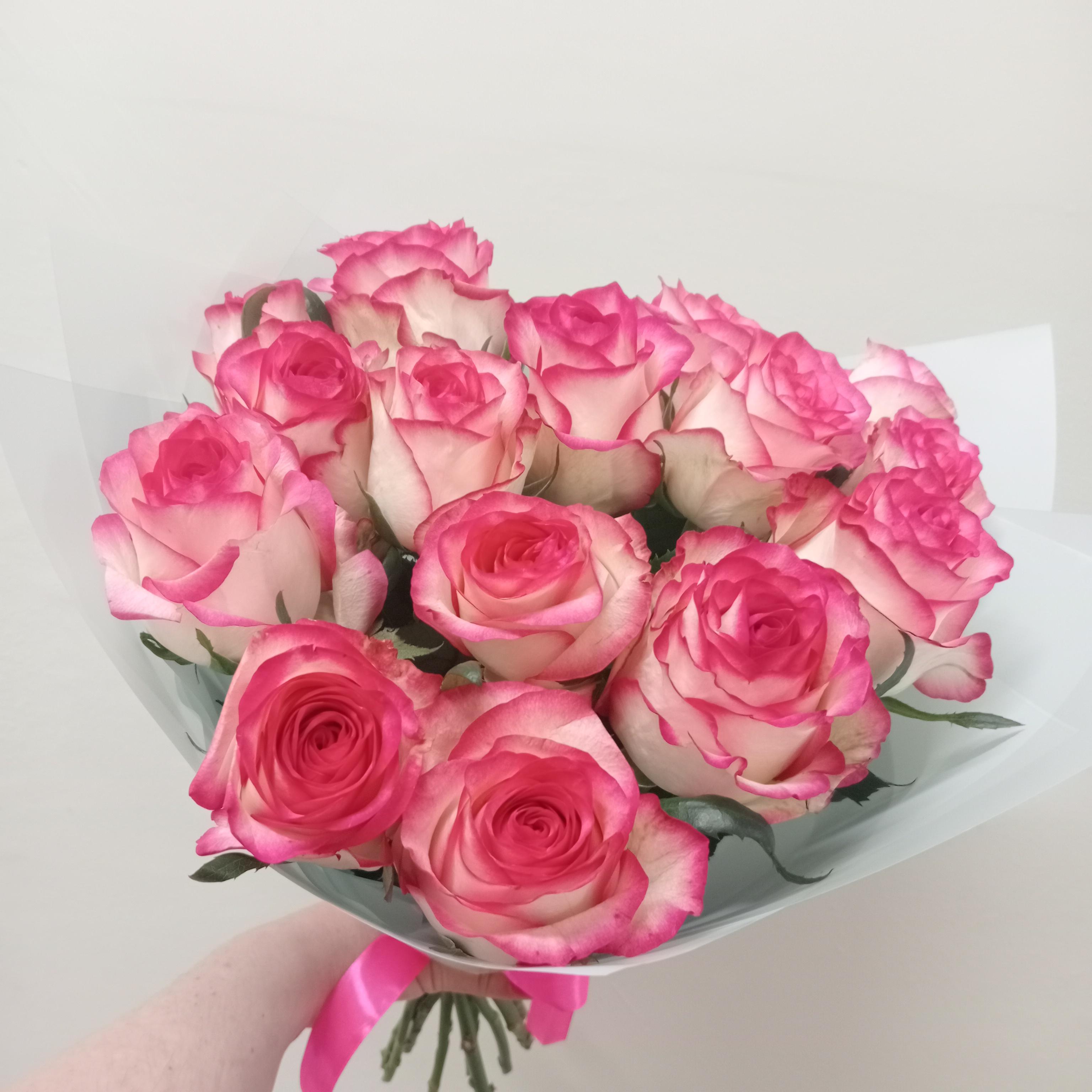 Самый популярный букет - 15 розовых роз Джумилия. Подходит для подарка женщинами и мужчинам, в любом возрасте и по разному поводу.